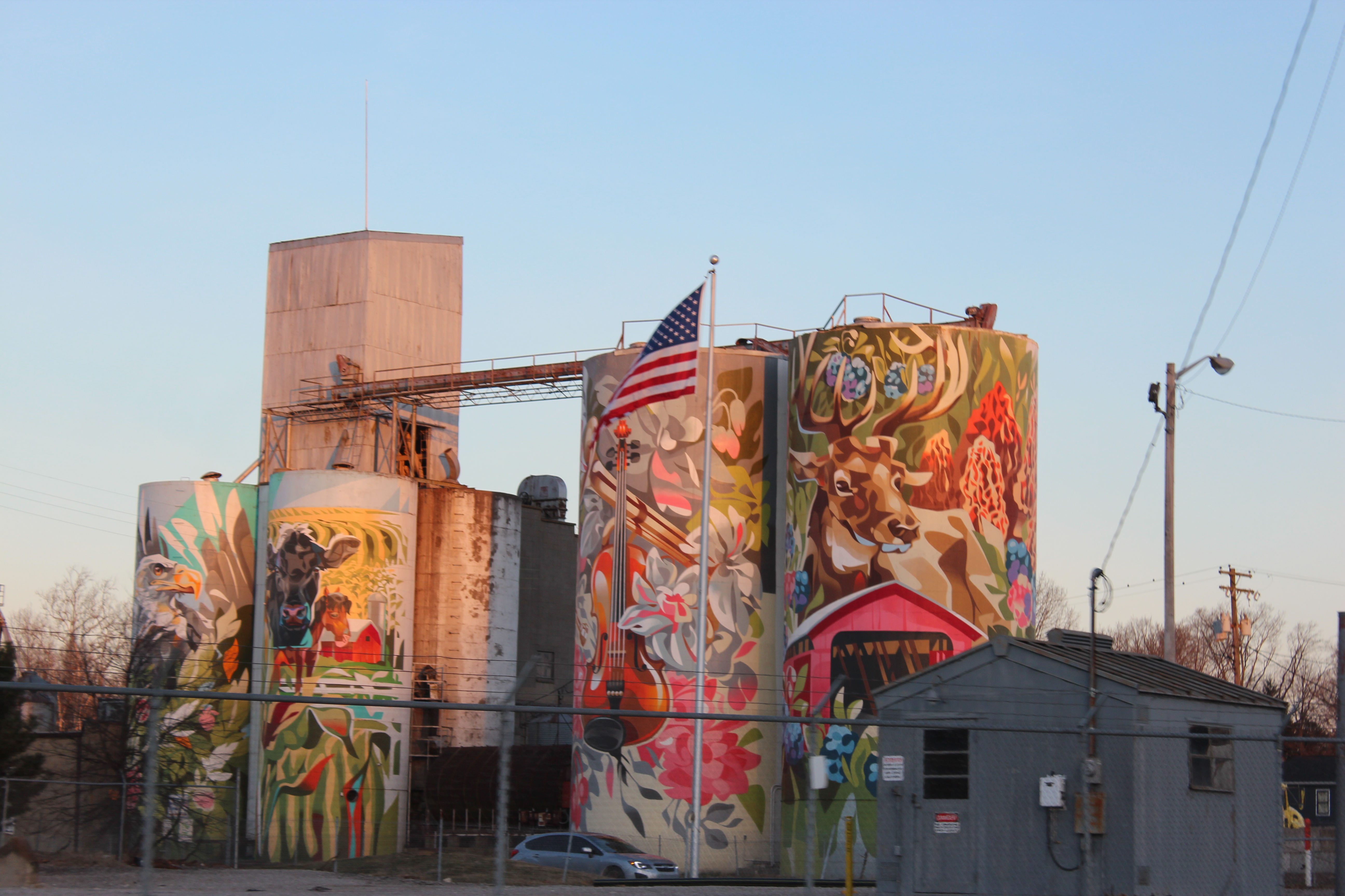 It occurred to me that we may only be visiting Greencastle one more time, for Ivy's graduation. I had never taken a picture of the murals on the grain towers. Fuzz hated them, but I think they're pretty. So I photographed them this time.